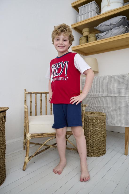 Pijama con estampa central y manga corta a contra tono con cuello redondo combinado con el mismo color del short. Short corte recto unicolor.