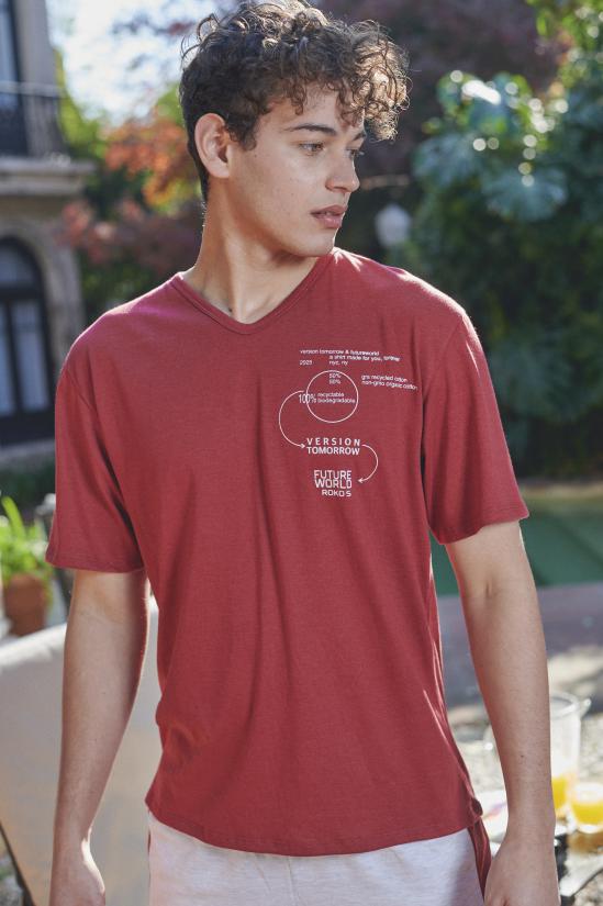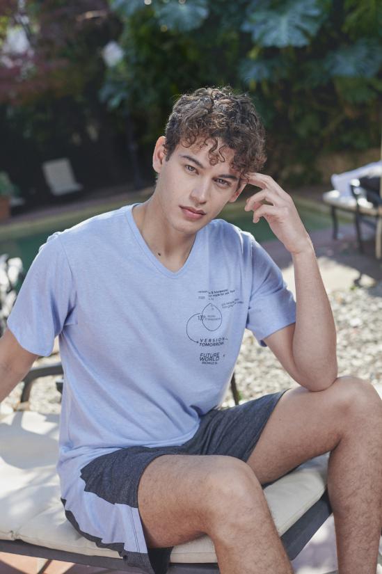 Pijama escote en V, manga corta y estampa en el pecho. Short con corte a los costados a contratono haciendo combinación con el color de la remera.